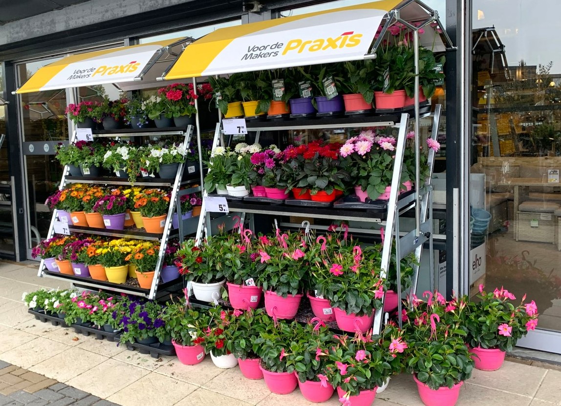 Einer der führenden Baumärkte der Niederlande, Praxis, verkauft seit Jahren auch immer mehr Beetpflanzen, Sommerblumen und Stauden. Auch hier bietet unser Horti-Display mit dem Dach im Hausstil einen Mehrwert in Bezug auf die Präsentation und damit mehr Umsatz sowie eine bessere Qualität der Pflanzen sowohl zum Zeitpunkt des Verkaufs als auch letztendlich beim Kunden zu Hause.