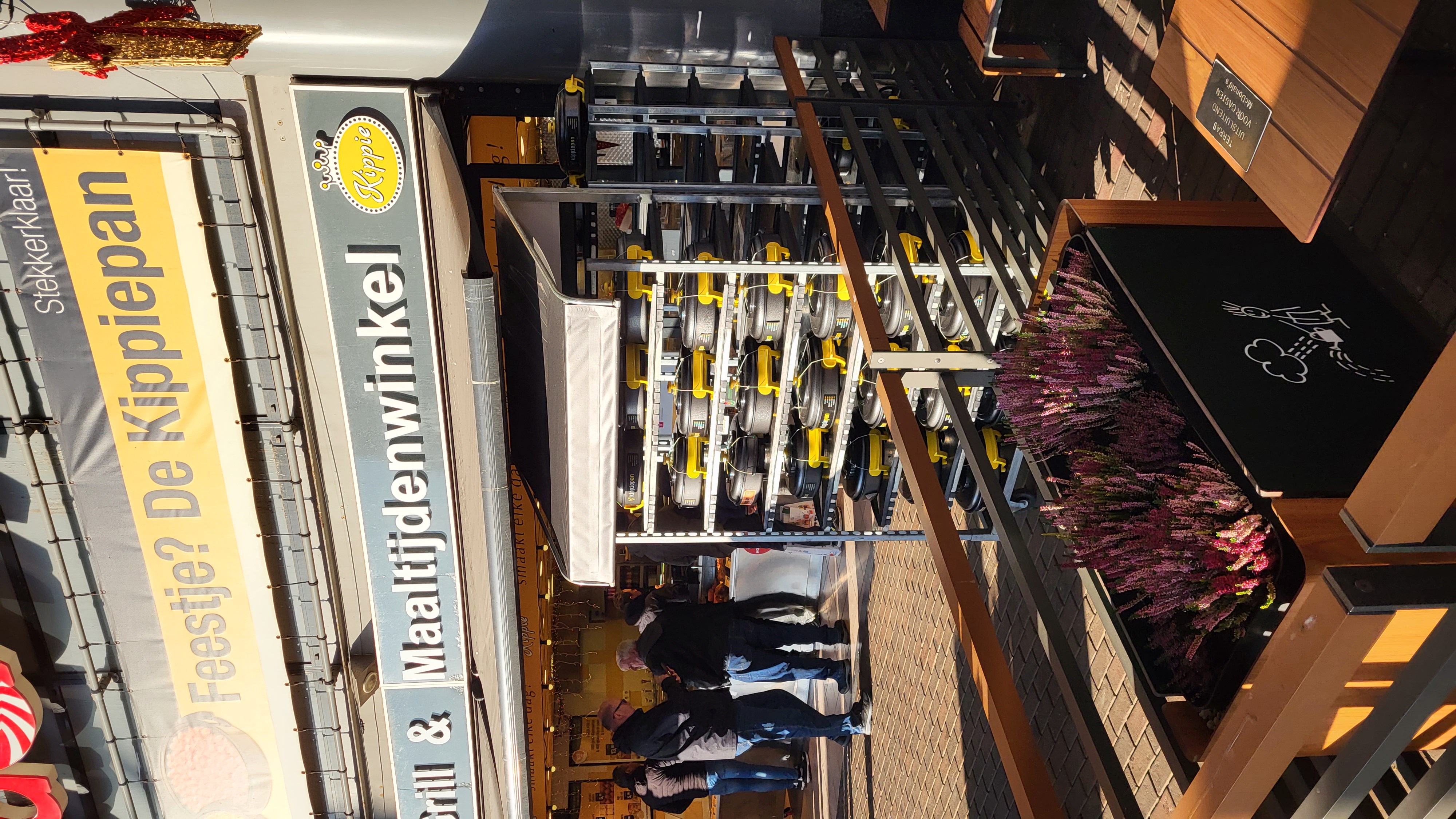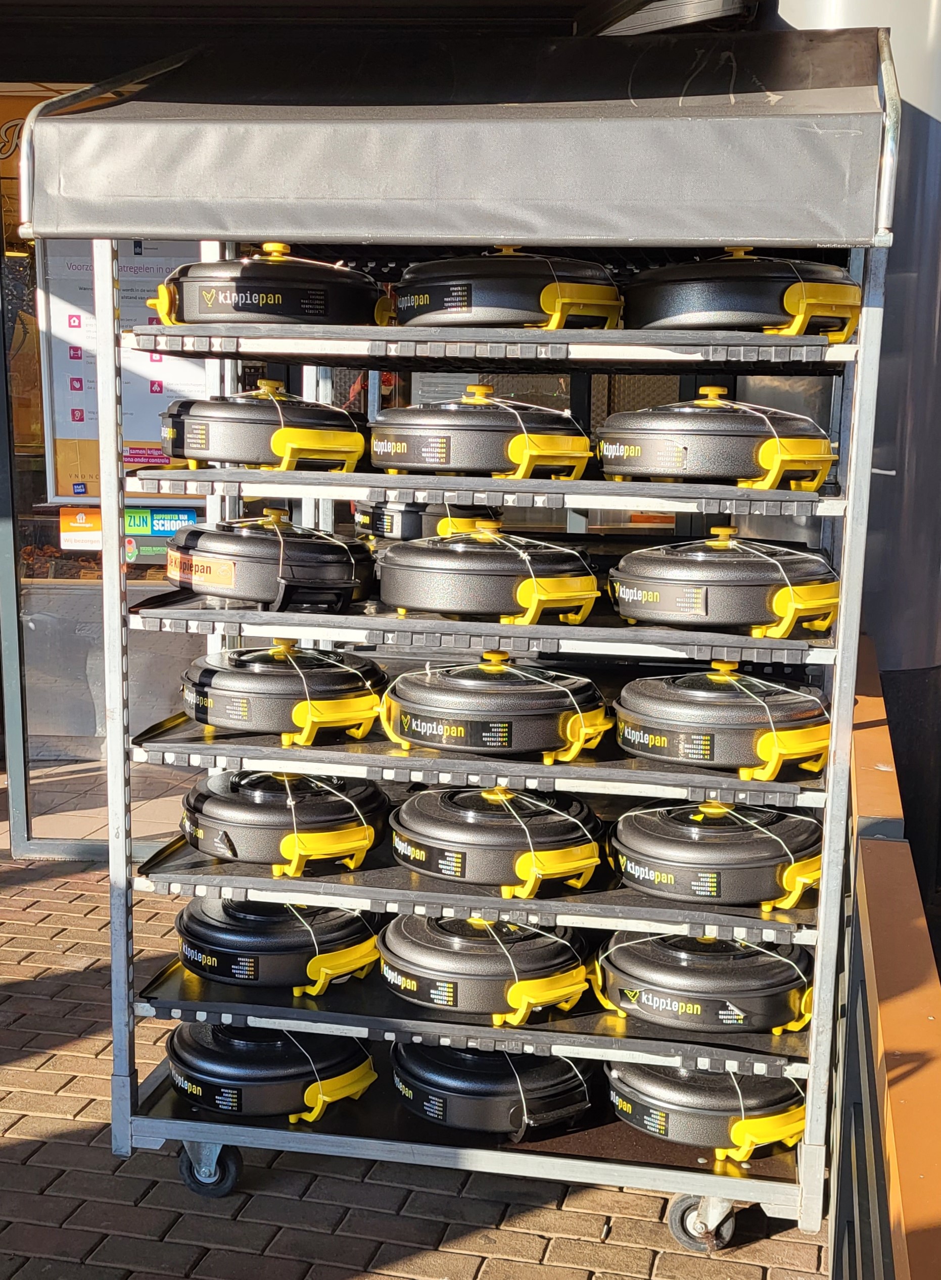Ein weiteres gutes Beispiel für den dänischen Karrenals Präsentationsmittel haben wir in einem Kippie-Geschäft gefunden: ein Wagen mit (leeren) Kippie-Pfannen und einem Horti-Roof, einem der Dachsysteme aus unserem Sortiment, darauf. Der Wagen ist mit unseren robusten, hygienischen Kunststoffplatten ausgestattet. Diese Platten haben eine höhere Belastbarkeit, sind abwaschbar und durch die glatte Oberfläche haben Bakterien und Pilze keine Chance, sich einzunisten.