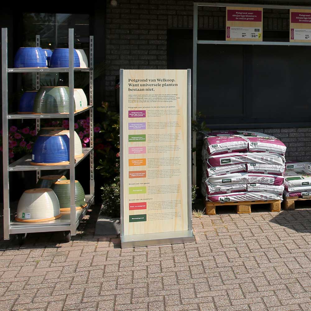 Welkoop, eine Niederländische Kette mit mehr als 150 Filialen, ist für ihr hochwertiges und breites Pflanzensortiment bekannt. Seit vielen Jahren arbeiten wir gemeinsam an Ideen für ein attraktiveres und anregenderes Umfeld zur Präsentation dieser Produkte.